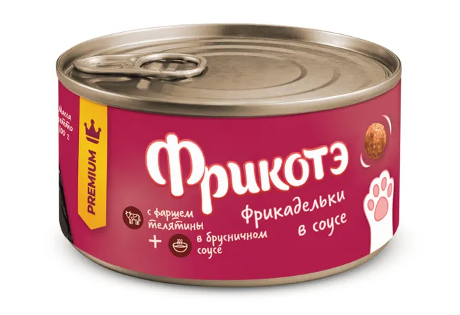 Банки Фрикотэ для взрослых кошек фрикадельки с телячьим фаршем в брусничном соусе